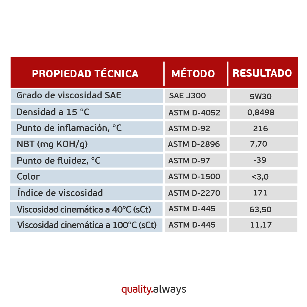 desarrollado para uso en todas las estaciones en vehículos modernos con motores de gasolina y diésel, incluyendo los de turismos, SUV, furgonetas y camiones ligeros. Este lubricante es adecuado para motores de automóviles equipados con inyección directa, motores con sistemas de sincronización variable de válvulas (VVT) y/o motores turboalimentados. Recomendado para uso en todas las estaciones del año.